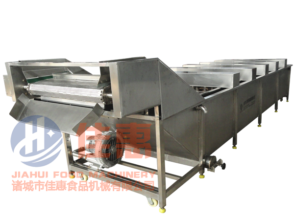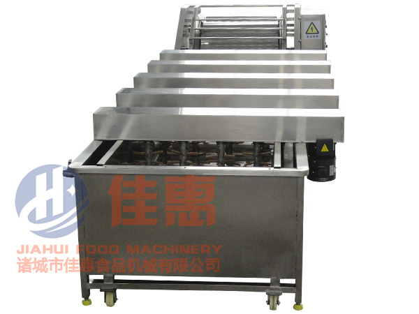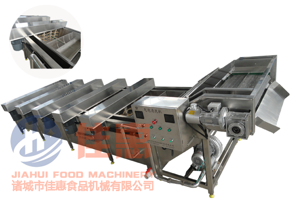| 設(shè)備簡介: 1、該設(shè)備為氣泡清洗機(jī)的改進(jìn)設(shè)備,槽體上方加裝了橡膠攪拌裝置,目的是針對(duì)不同的清洗物料達(dá)到不同的清洗效果,特別是對(duì)玉螺菜(別稱螺絲菜、寶塔菜)等根須比較發(fā)達(dá)的根莖類蔬菜清洗效果顯著。 2、氣泡清洗機(jī)(鼓泡清洗機(jī))設(shè)備除電機(jī)、軸承等標(biāo)準(zhǔn)件外均采用不銹鋼SUS304/2B材料制作,完全符合出口食品衛(wèi)生要求。設(shè)備中設(shè)有氣泡發(fā)生裝置,使物料呈翻滾狀態(tài),去除產(chǎn)品表面農(nóng)殘的功效,同時(shí)可加入適量的藥劑,進(jìn)行消毒固色。漂浮物可以從溢流槽溢出,沉淀物從排污口排出,以達(dá)到清洗的目的。具有洗潔凈高、節(jié)能、節(jié)水、設(shè)備穩(wěn)定可靠等特點(diǎn)。 3、氣泡清洗機(jī)(鼓泡清洗機(jī))輸送部分采用SUS304不銹鋼網(wǎng)帶,運(yùn)行平穩(wěn)、使用壽命長等特點(diǎn),符合食品衛(wèi)生要求。 4、流水線中各單機(jī)可根據(jù)用戶各自不同的加工特點(diǎn)量身定制:可加裝滾筒和毛刷、過濾泡沫和漂浮物,大程度滿足工藝要求。 5、清洗運(yùn)行速度無級(jí)可調(diào),用戶可根據(jù)不同的清洗內(nèi)容任意設(shè)定,該機(jī)結(jié)構(gòu)緊湊,自動(dòng)化程度高,適用于各種加工規(guī)模企業(yè)使用。 設(shè)備特點(diǎn):   1、設(shè)備帶有循環(huán)水泵和過濾水箱,實(shí)現(xiàn)清洗用水循環(huán)使用,節(jié)約用水,根據(jù)實(shí)際生產(chǎn)情況補(bǔ)充更換新水; 2、設(shè)備輸送帶電機(jī)可實(shí)現(xiàn)調(diào)節(jié)變速功能,被清洗的蔬菜經(jīng)過網(wǎng)鏈輸送,自動(dòng)送料,自動(dòng)出料,根據(jù)生產(chǎn)需要調(diào)節(jié)輸送帶輸送速度; 3、設(shè)備出料提升段帶有噴淋裝置,在清洗結(jié)束后輸送至下道工序過程中,對(duì)產(chǎn)品進(jìn)行噴淋,減少二次污染. 4、可根據(jù)用戶要求增加去雜裝置,如:毛刷、濾網(wǎng)等。 設(shè)備示意圖:  工作原理: 首先需要清洗的蔬菜全部放入水槽,在高壓水流和強(qiáng)力氣泡的作用下,被充分打散、翻滾、清洗、傳送。蔬菜表面的泥沙會(huì)脫落,經(jīng)由網(wǎng)帶沉淀到底部隔離倉,防止翻揚(yáng)回流造成再次污染。且蔬菜上洗落下來的雜物和小蟲會(huì)漂浮在水面,然后被轉(zhuǎn)籠裝置收集排出水槽。洗凈的物料出水后,再經(jīng)過斜坡高壓噴淋的清洗,提升輸送到下道工序,介質(zhì)水可過濾循環(huán)使用。 技術(shù)參數(shù):